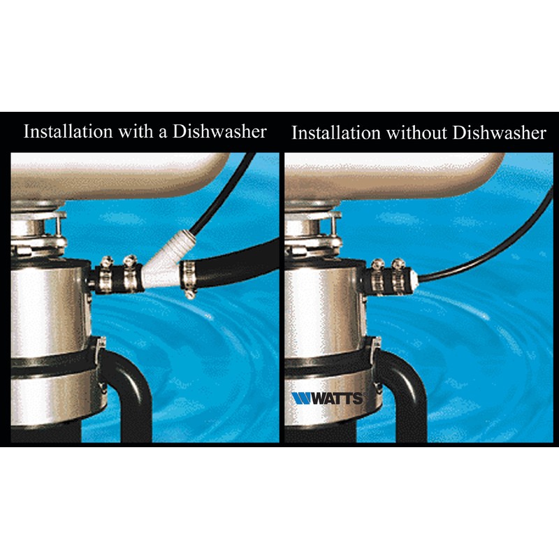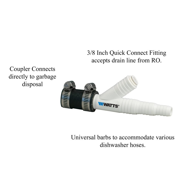 - Converts for installation with or without a dishwasher drain line connection, uses standard plumbing fittings to meet nationwide code requirements and a universal adapter accommodates 1/2"", 5/8"", 3/4"", and 7/8"" dishwasher drain hose with a 3/8"" RO drain line