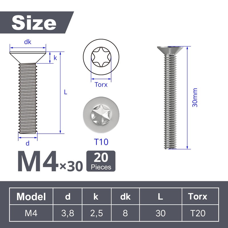 Each pack contains 20pcs of full-thread, countersunk head Torx bolts (304 Stainless Steel).