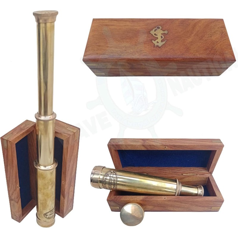 • NAUTICAL ANTIQUE Marine Telescope Great addition to your maritime or pirate collection.Handmade Beautiful Telescope With Wooden est Quality of Unique gift item Long life Best Quality material of brass, Brass Antique Finish, Focus Adjustment using the telescope