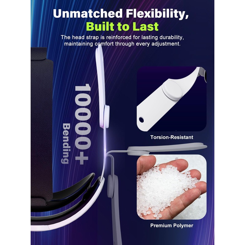 The head strap for Meta Quest 3 is designed for extended, comfortable, and immersive VR gameplay. For unmatched comfort, the head strap features memory foam and a milk-soft PU cushion, weighing only 30g and with 60° adjustable hinges to prevent pressure marks during long sessions. The side and top straps, made from premium polymer materials, are highly durable and flexible, passing 100,000 bending tests. With a smooth gear knob, the strap adjusts easily to fit head sizes from 19.9 to 29.5 inches, making it ideal for both teenagers and adults.