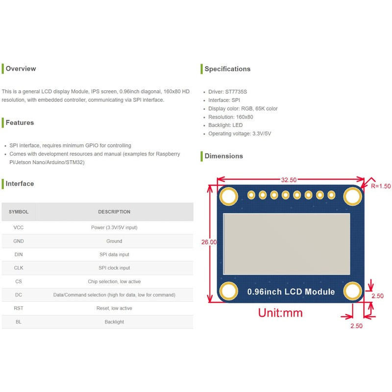 • This is a general LCD display Module, IPS screen, 0.96inch diagonal, 160x80 HD resolution, with embedded controller, communicating via SPI interface.