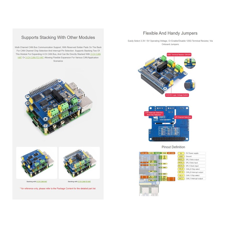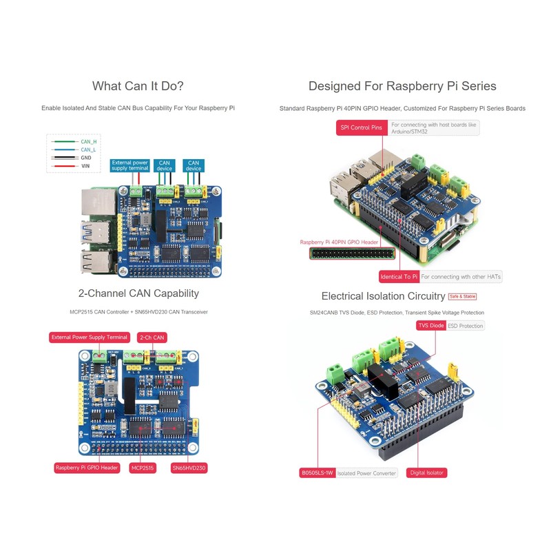 2-Channel Isolated CAN Bus Expansion HAT For Raspberry Pi, Dual Chips Solution, Stackable Design For Expanding Multiple CAN Channels Features At A Glance The 2-CH CAN HAT+ is a 2-Channel CAN bus expansion HAT designed for Raspberry Pi. Supports expanding multiple CAN channels by stacking with the 2-CH CAN HAT or 2-CH CAN FD HAT. Adopts HAT+ standard design, compatible with Raspberry Pi series boards such as Raspberry Pi 5/4/3/Zero. Onboard various protection circuits, including electrical isolation to make communication more safe and reliable. Supports wide range voltage input of 736V, suitable for industrial applications. Standard Raspberry Pi 40PIN GPIO extension header, supports Raspberry Pi series boards / Jetson Nano Adopts MCP2515 and SN65HVD230 dual chips combined solution, allows 2-channel CAN communication Onboard unibody power supply isolation, providing stable isolated voltage, requires no extra power supply for the isolated terminal Onboard digital isolator, signal isolation makes the communication more safe and stable, and better anti-interference Onboard external power supply terminal, supports 736V wide voltage power input, supports powering the Pi and the HAT at the same time Onboard SM24CANB TVS (Transient Voltage Suppressor) diode, provides ESD protection and transient peak voltage protection Onboard voltage translator, select 3.3V/5V operating voltage by jumper Onboard 120Ω terminal resistor, configured by jumper Breakout SPI and I2C control pins, for connecting with other host control boards Comes with online development resources and manual (examples in Python/C) Parameters Input voltage: 5V, 736V Logic level: 3.3V/5V CAN controller: MCP2515 CAN receiver: SN65HVD230 Dimensions: 65.0x56.5mm Mounting hole diameter: 3.0mm Package Content 2-CH CAN HAT+ x1 Screws pack x1