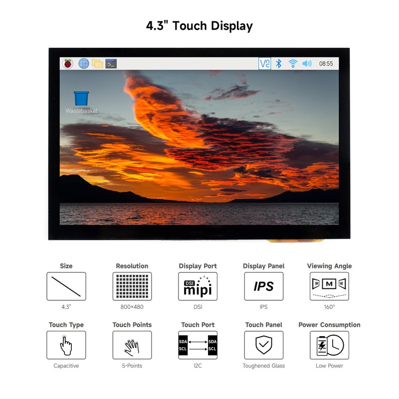 - 4.3inch Capacitive Touch Display for Raspberry Pi, 800×480, IPS Wide Angle, MIPI DSI Interface.