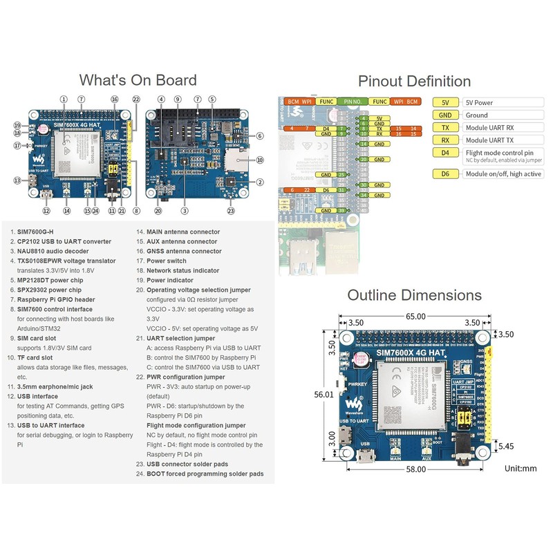 - Standard Raspberry Pi 40PIN GPIO extension header, supports Raspberry Pi series boards, Jetson Nano Supports dial-up, telephone call, SMS, TCP, UDP, DTMF, HTTP, FTP, etc. Supports GPS, BeiDou, Glonass, GALILEO, QZSS, LBS base station positioning