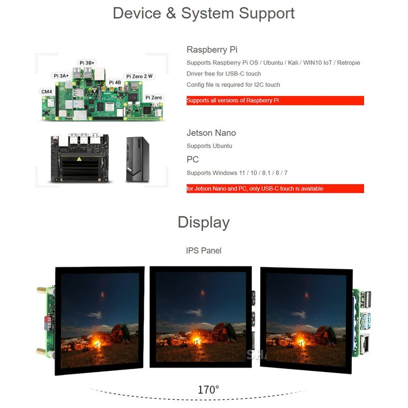 - Supports all versions of Raspberry Pi. For Jetson Nano and PC, only USB-C touch is available