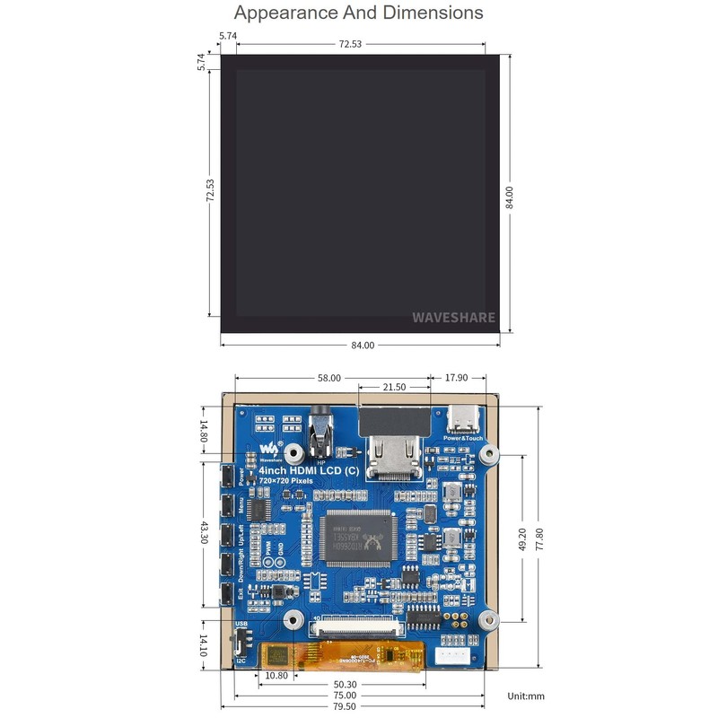 waveshare 4inch HDMI Capacitive Touch IPS LCD Display Compatible with Raspberry Pi 4B/3B+/3A+/2B/B+/A+/Zero/Zero W/WH/Zero 2W CM3+/4 720×720 Resolution Supports Jetson Nano/Windows