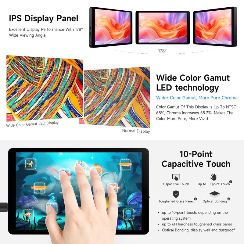 - Up to 10-point touch, depending on the operating system up to 6H hardness toughened glass panel Optical Bonding, display well and dustproof