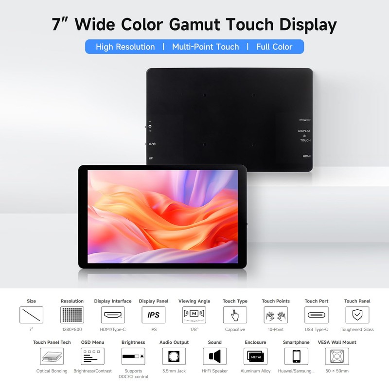Waveshare 7inch Capacitive Touch Display,1280×800 Resolution, Compatible with Raspberry Pi 5/4B/3B/Zero/Zero W/Zero 2W/Pico/Pico, Supports Jetson Nano/RDK X3/VisionFive2/Windows/Smartphone