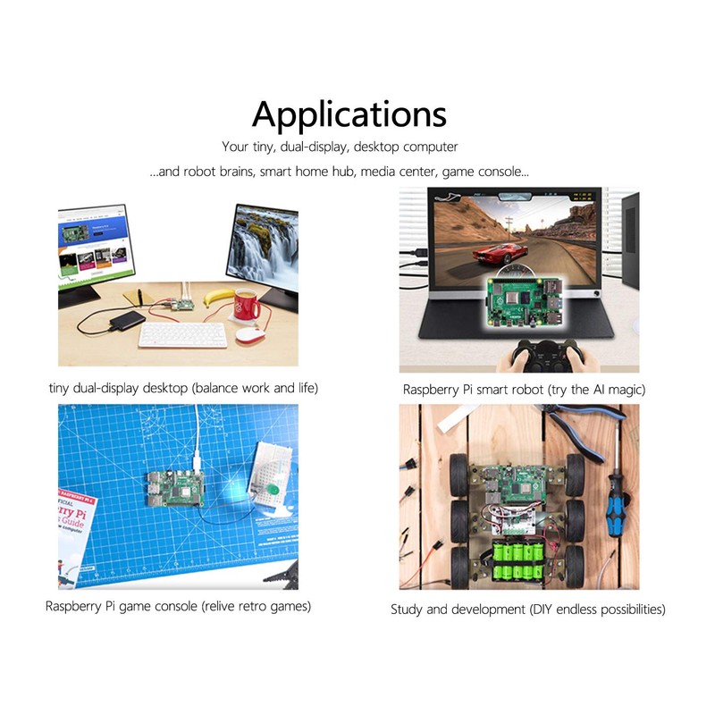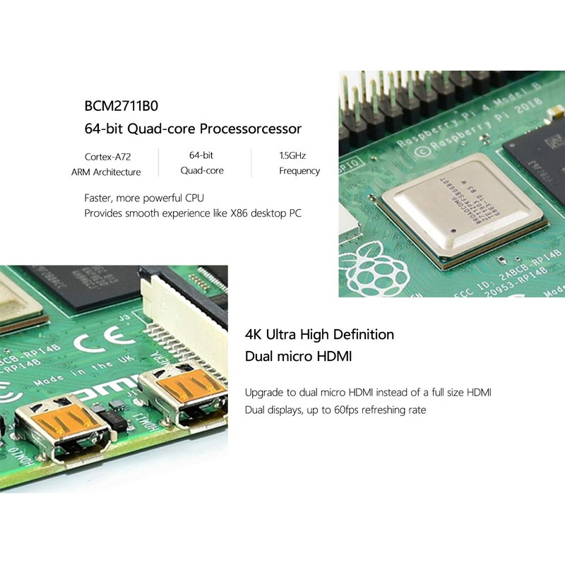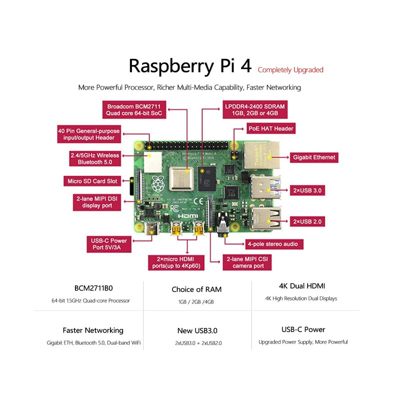 Raspberry Pi 4 Model B, the completely upgraded, re-engineered model of the Pi family. It has more powerful processor, faster networking, supports dual 4K output, and provides different choice of RAM.