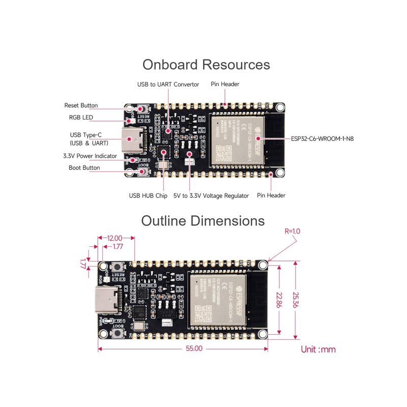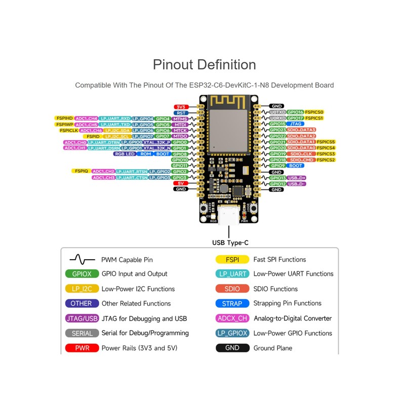 - Rich peripheral interfaces, compatible with the pinout of the ESP32-C6-DevKitC-1-N8 development board, offers strong compatibility and expandability.Castellated module allows soldering directly to carrier boards