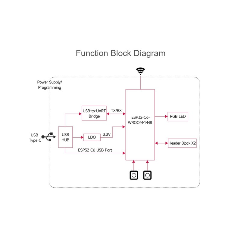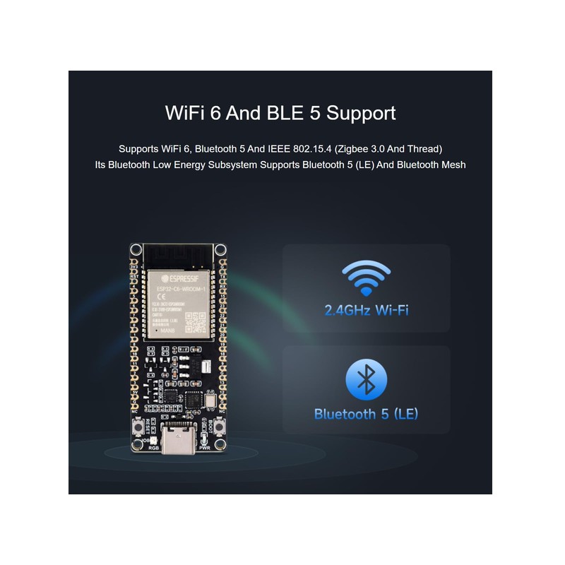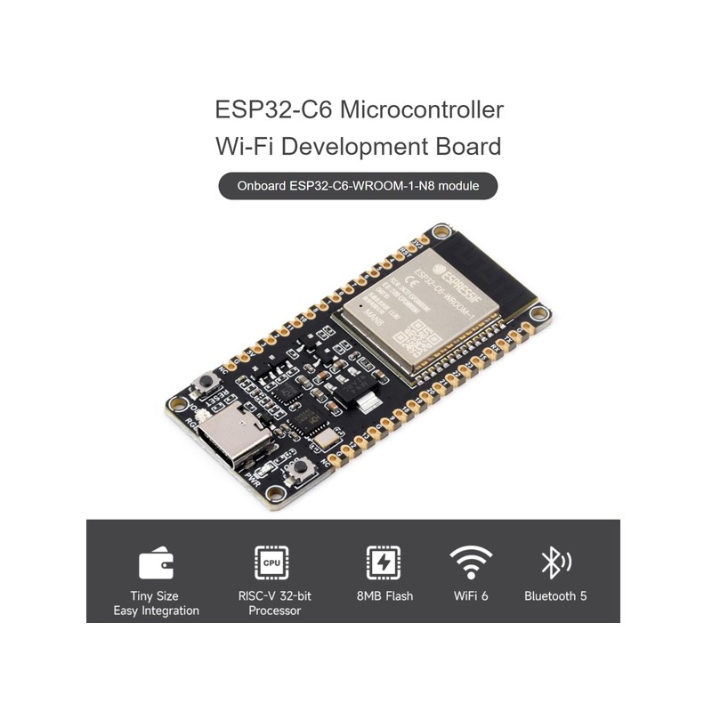 - Adopts ESP32-C6-WROOM-1-N8 module with RISC-V 32-bit single-core processor, up to 160MHz main frequency, built-in 8MB Flash