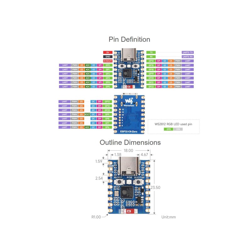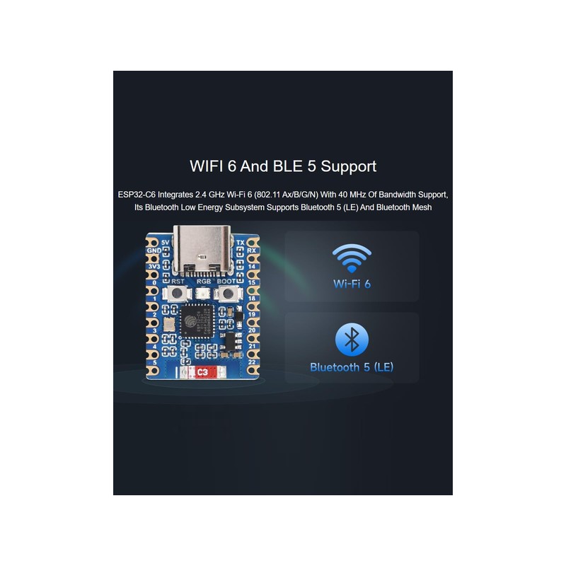 waveshare ESP32-C6 WiFi 6 Mini Development Board with Pre-soldered Header Based on ESP32-C6FH4 Dual Processors, 2.4GHz WiFi 6 +Bluetooth 5(LE) and Bluetooth Mesh,Compatible with ESP-IDF,Arduino