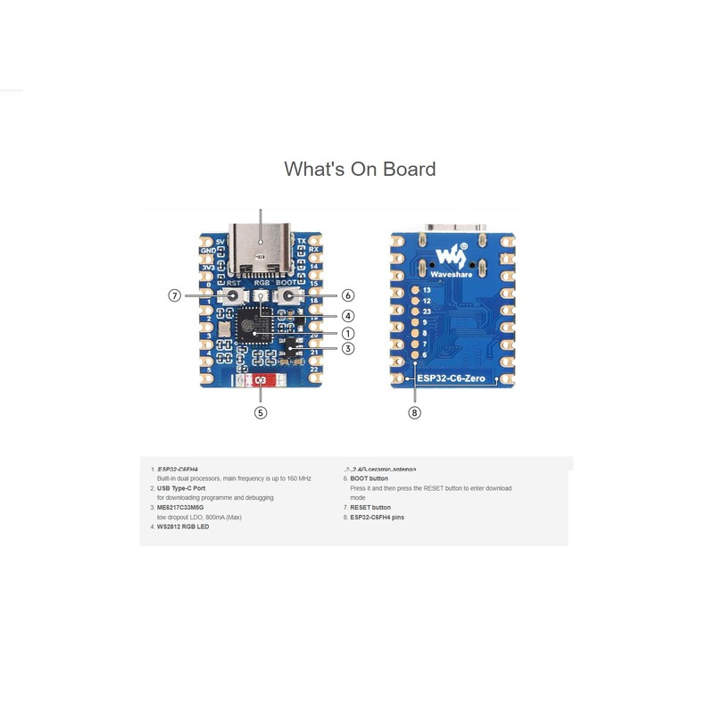 - Adopts ESP32-C6-MINI-1 as the main chip, with RISC-V 32-bit single-core processor, support up to 160 MHz.
