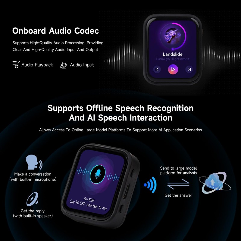- Adopts AXP2101 IC for efficient power management, supports multiple voltage outputs, battery charging, battery management, and battery life optimization, etc. Adopts AMOLED screen, featuring advantages of high contrast, wide viewing angle, rich colors, fast response, thinner design, and low power consumption, etc