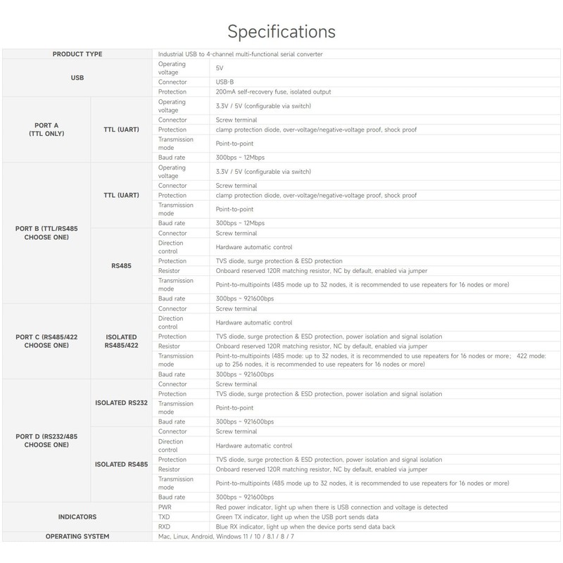 - Supports USB to 1-ch TTL + 1-ch TTL/RS485 + 1-ch isolated RS485/422 + 1-ch isolated RS232/485. Onboard unibody power supply isolation, provides stable isolated voltage, needs no extra power supply for the isolated terminal. Onboard unibody digital isolation, allows signal isolation, high reliability, strong anti-interference, low power consumption