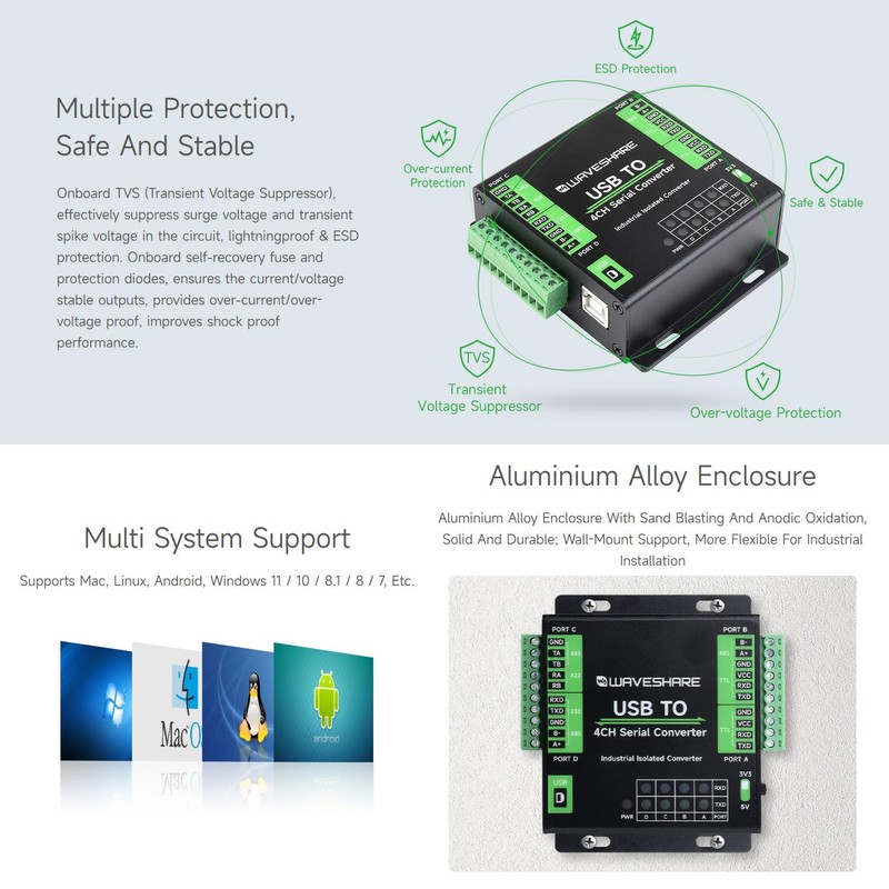 Waveshare Industrial USB to 4-Ch Serial Converter, Original FT4232HL Chip, Supports USB to RS232/485/422/TTL, Multiple Devices Applicable, Multi-OS Compatible