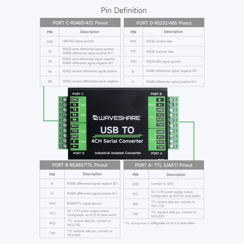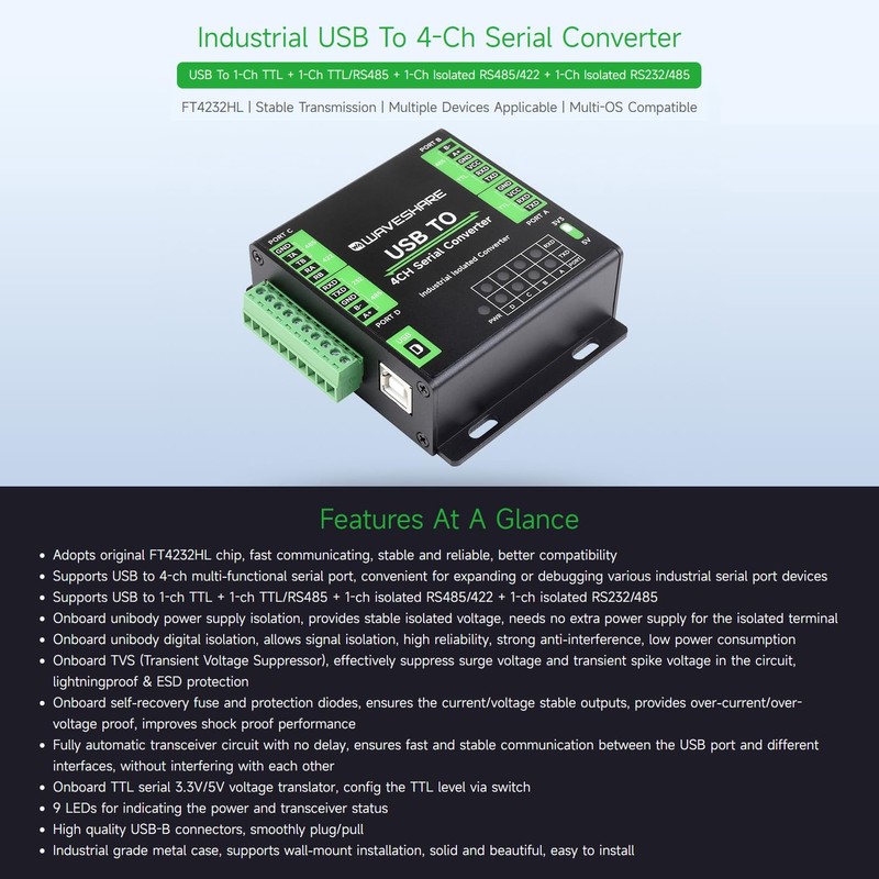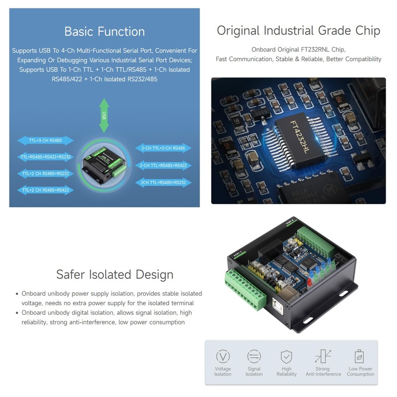 - Supports USB to 1-ch TTL + 1-ch TTL/RS485 + 1-ch isolated RS485/422 + 1-ch isolated RS232/485. Onboard unibody power supply isolation, provides stable isolated voltage, needs no extra power supply for the isolated terminal. Onboard unibody digital isolation, allows signal isolation, high reliability, strong anti-interference, low power consumption