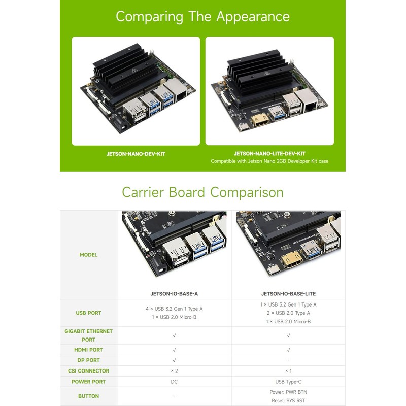 - Compared with the JETSON-NANO-DEV-KIT, the peripheral interfaces are less but the performance of the core module remains the same, which is suitable for the scenarios that require less interfaces, more cost-effective.