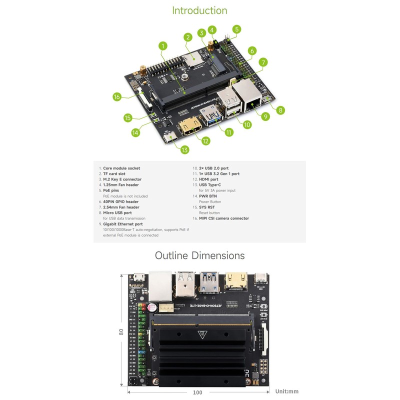 - Based on Jetson Nano Module (with 16GB eMMC), it provides almost the same size and thickness as official Jetson Nano 2GB Developer Kit.