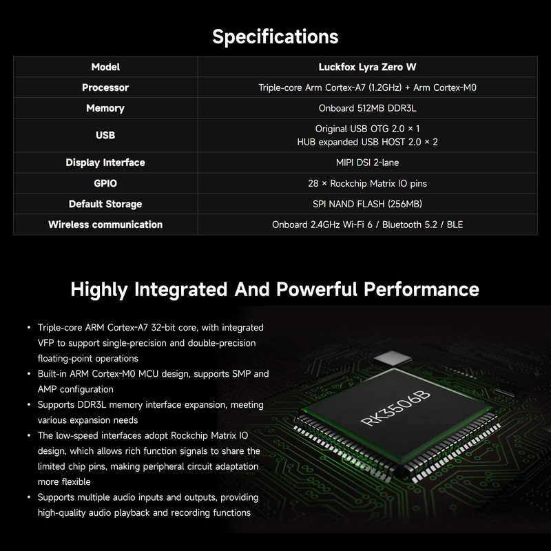 - Powerful Processor for Embedded Systems: The Luck-fox Lyra Zero W is powered by the Rockchip RK3506B SoC, featuring a 1.2GHz ARM Cortex-A7 processor, delivering smooth performance for running Linux-based applications and making it suitable for embedded and IoT projects.
