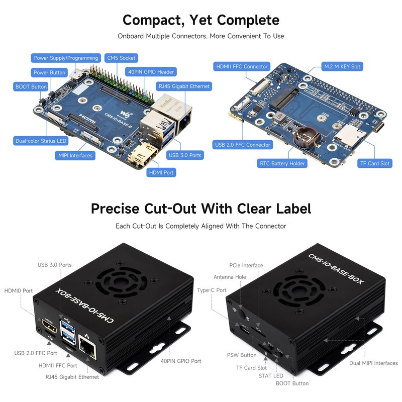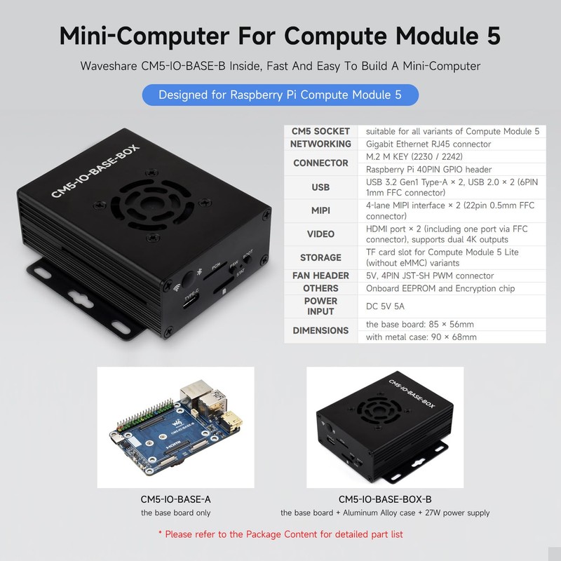 Waveshare Mini Base Board, Mini-WaComputer Designed for Raspberry Pi Compute Module 5 (NOT Included), Onboard EEPROM and Encryption Chip, Including Metal Case and Power Supply