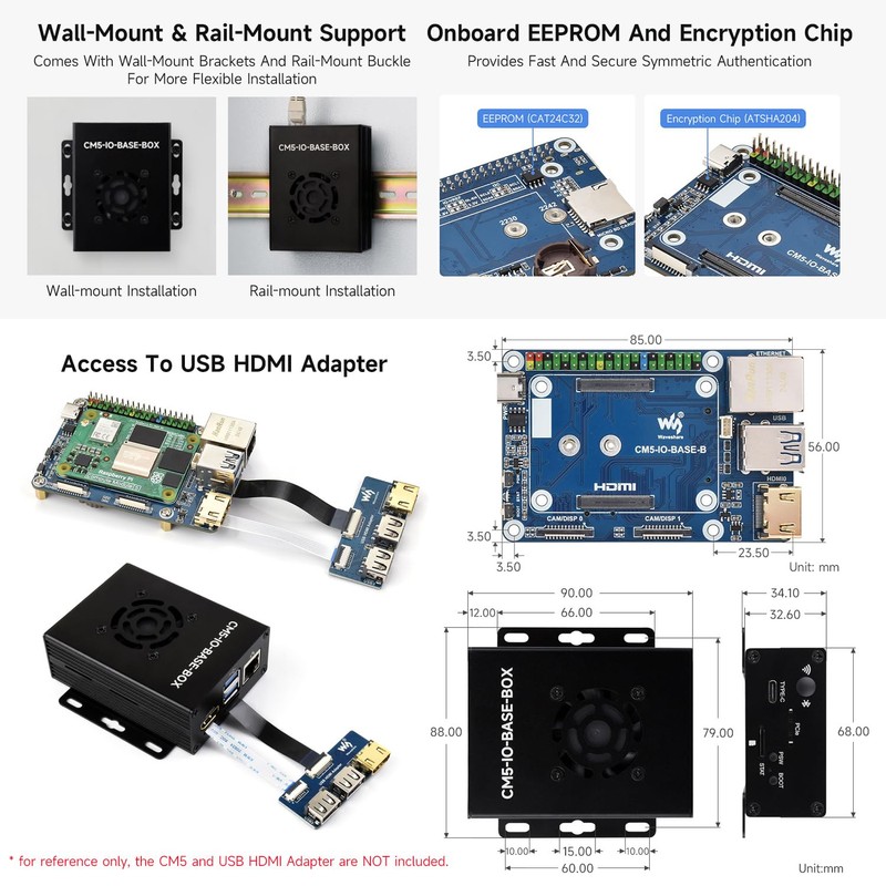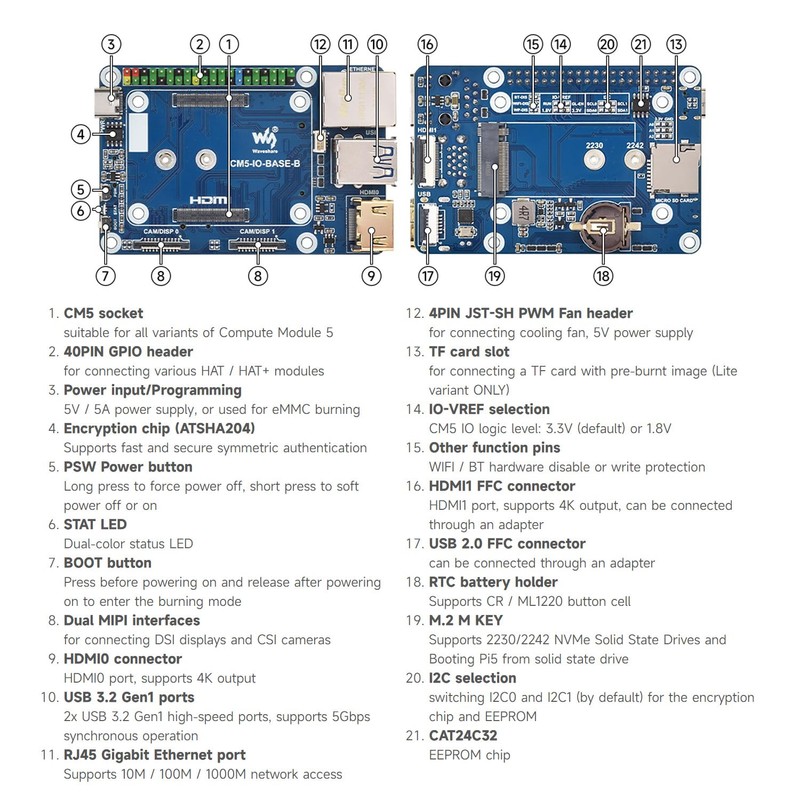 • Storage & Power: Offers a TF card slot for Compute Module 5 Lite variants (without eMMC) and a 5V, 5A DC power input for reliable power delivery, along with an onboard EEPROM and encryption chip.