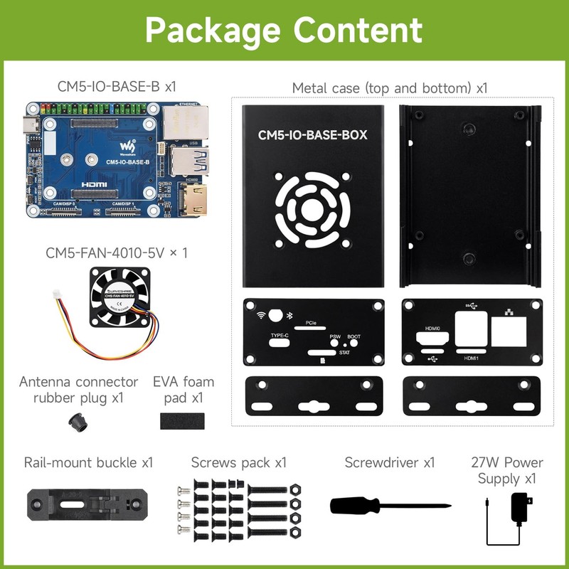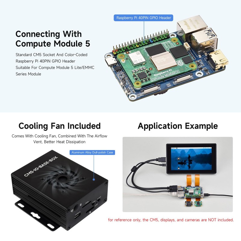 • Compatibility & Connectors: The base board is compatible with all variants of the Raspberry Pi Compute Module 5 (CM5) and includes an M.2 M KEY (2230/2242) connector, Raspberry Pi 40PIN GPIO header, and dual HDMI ports supporting 4K output.