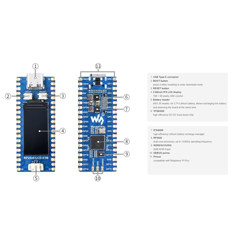 waveshare RP2040-LCD-0.96 Mini Board High-Performance Pico-Like MCU Board Based on Raspberry Pi Microcontroller RP2040,Onboard 0.96 inch LCD,USB-C Connector,Low-Cost, Support C/C++,MicroPython