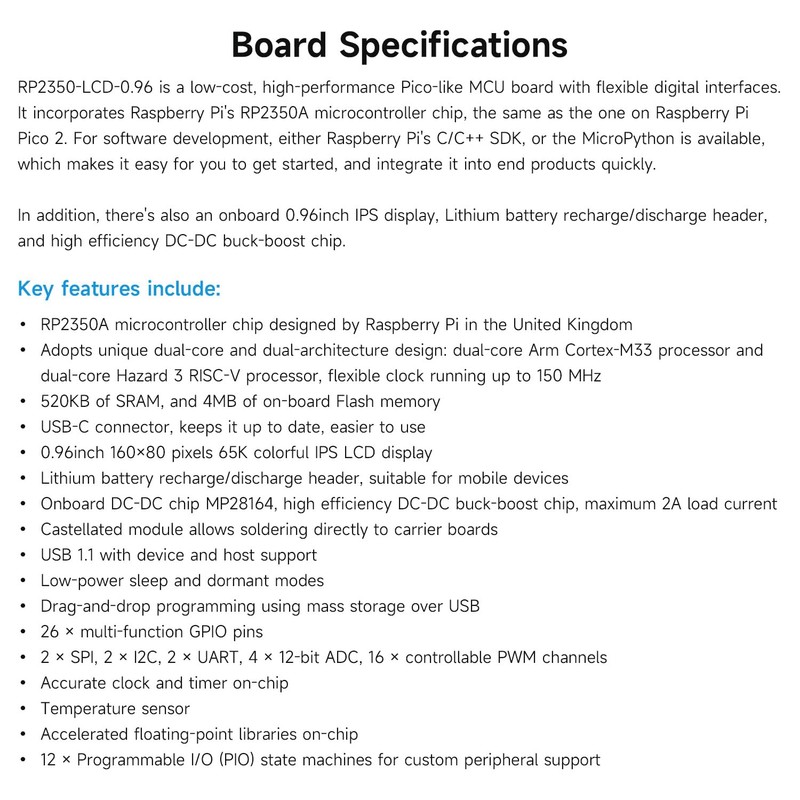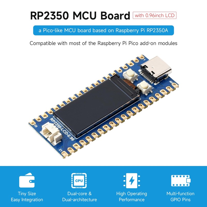 - RP2350-LCD-0.96 is a low-cost, high-performance Pico-like MCU board with flexible digital interfaces. It incorporates Raspberry Pi's RP2350A microcontroller chip, the same as the one on Raspberry Pi Pico 2. For software development, either Raspberry Pi's C/C++ SDK, or the MicroPython is available, which makes it easy for you to get started, and integrate it into end products quickly.