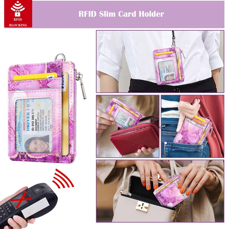 - Package includes: 1 x wrist lanyard, wallet holder with 6 x card slots, 1 x ID window, 1 x finger groove,1 x zipper pocket for money/bills. Easily holds your ID, Name Badge, Badge Holder, Cards, Money and Bills.