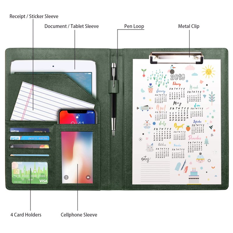 - Multifunctional Document Organizer: Portfolio as a clipboard, suitable for A4 paper, strong clip holds paper steady.This leather portfolio is also designed with pockets. 4 card holders, a phone holder, a pen loop, a middle pocket and resume pocket. (paper and pen are NOT included).