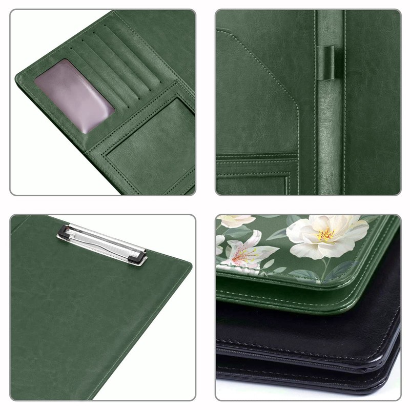 WAVEYU Portfolio Case for Women, Padfolio Cover for Girls, Conference/Resume/Legal Document Organizer with Letter/A4 Size Clipboard Hardboard, Business Card Holders, Green Flower