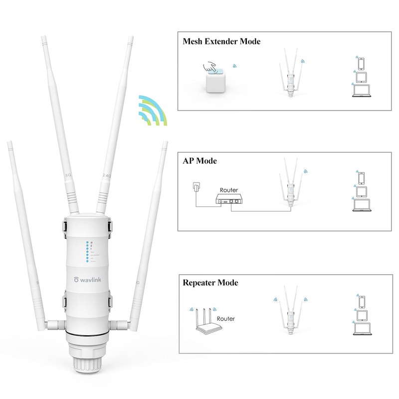- AC1200 Outdoor Wi-Fi Repeater: The WAVLINK WiFi Wireless LAN Repeater intermutes radio waves from the WiFi router, allowing you to expand the WiFi cover area. Wireless LAN standard supports IEEE802.11a/b/g/n/ac, which expands existing WiFi coverage and provides a more comfortable and faster communication environment. Can be used in a variety of situations, such as large businesses, cafes, hot spring hotels, family buildings, outdoor places, etc