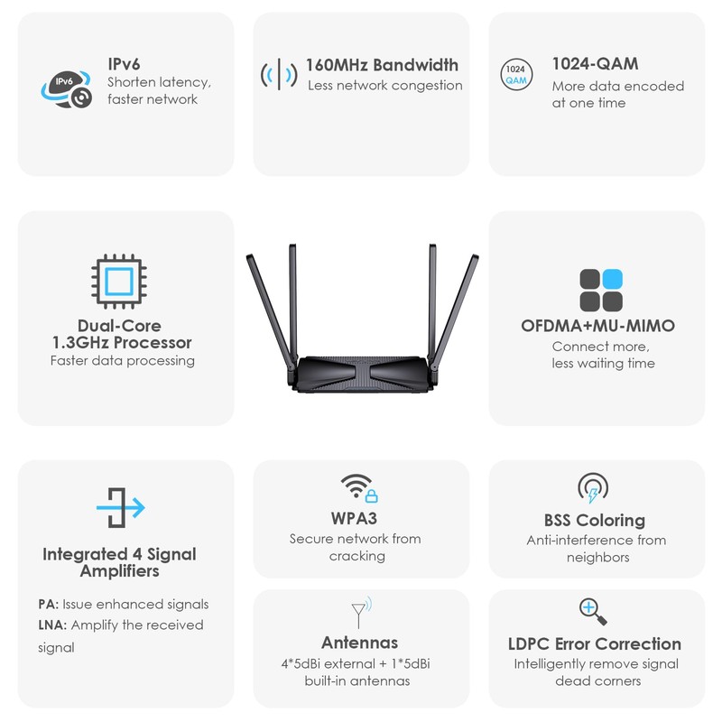 - ⭐【Dedicated to Reliable Network】Designed with a 1.3GHz dual core processor, IPv6, Beamforming+, 160MHz bandwidth, 1024QAM, WPA3 security protocol, TWT(Target Wakeup Time), BSS Coloring, LDPC Error Correction and more. Bring you ultra-smooth entertainment experience.
