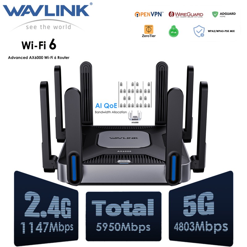 WAVLINK AX6000 WiFi 6 Mesh Router 8 Antennas Dual 2.5G Ports, AI QoE & VPN for Business