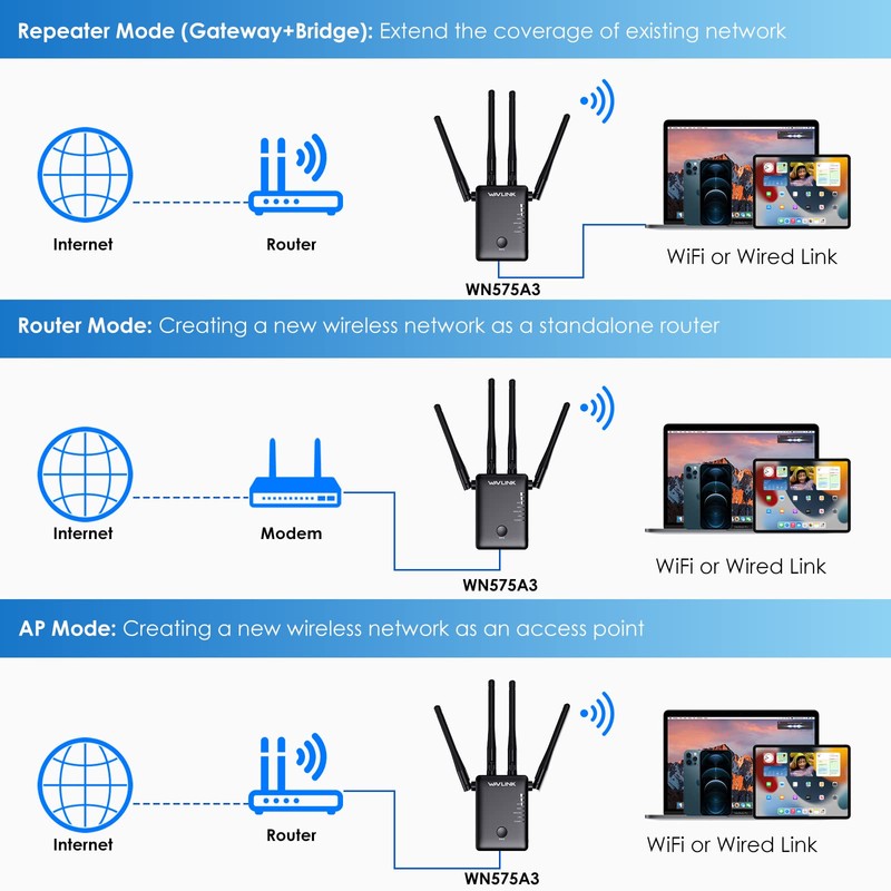 - ★【More than Just a Wi-Fi Extender】: 575A3 is not just repeater but wireless access point (AP) or router and you can choose any mode by the switch button.Easily expand wireless coverage, accessible from almost any device, including iOS and Android mobile platforms