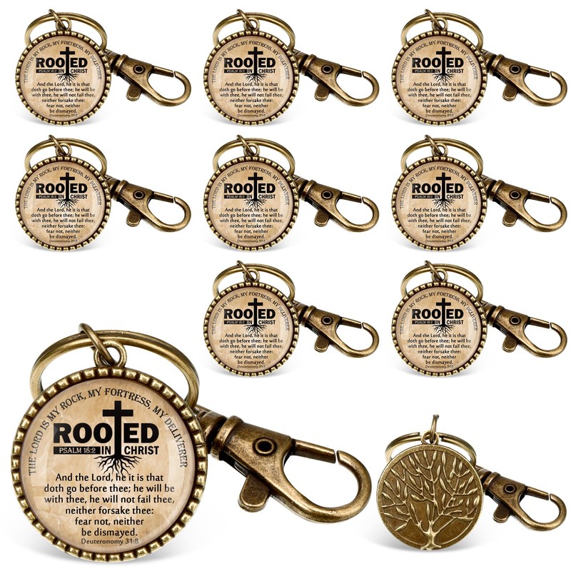 - You will receive 10 christian keychains, engraved with the root tree, and the other side is printed with the scripture "Rooted in Christ", which is very suitable as a gift for fathers, pastors and other religious workers