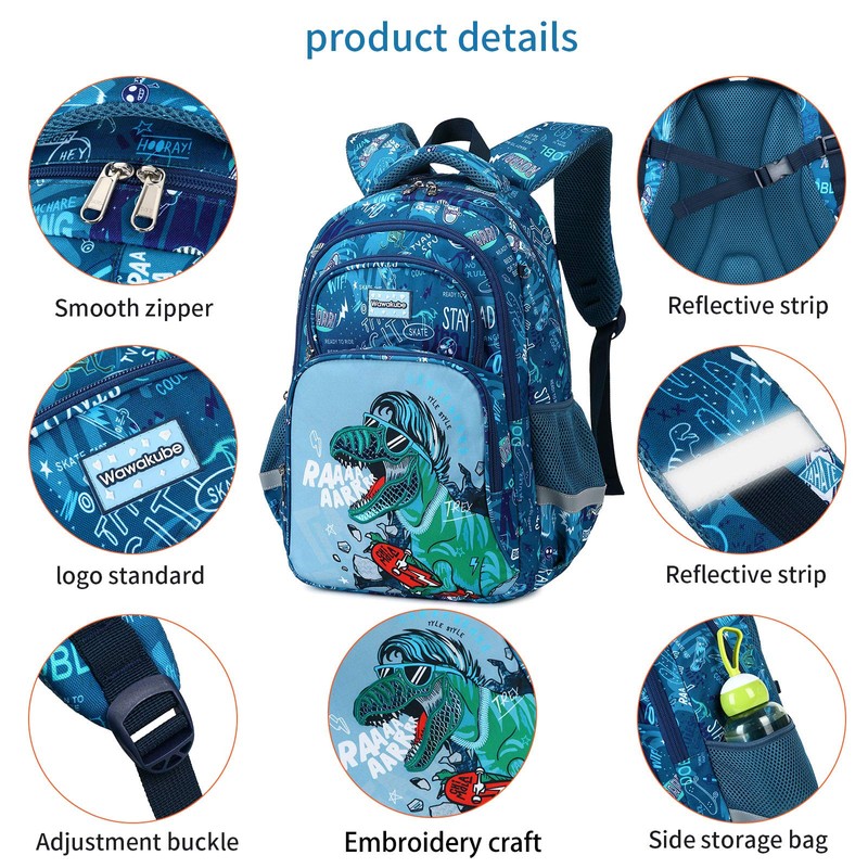 • 【Helpful Features】 Reflective tape is available on both shoulder straps and side storage bags, It's easier to spot at night or in fog. The lunch bag can keep food warm with the tin foil layer. And the stitched Dinosaur pattern is both beautiful and durable.POXTOBO
