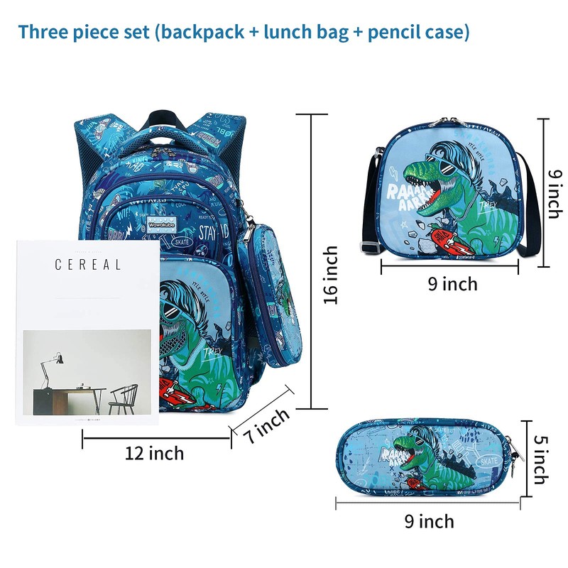 Wawakube Kids Backpack Set - 3Pcs Dinosaur Backpack with Lunch Box Bag and Pe...