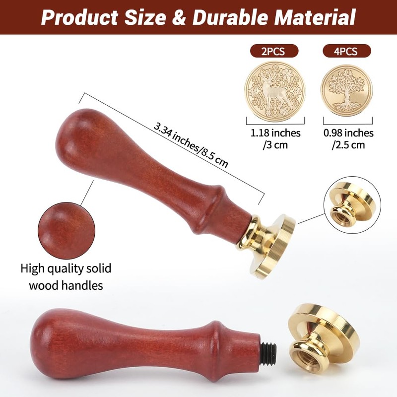 • Easy to use: our letter seal wax seals have a suitable size, the diameter of the 4 copper heads is about 0.98 inches/2.5 cm and the diameter of the 2 sealing copper heads is 1.18 inches/3 cm; inches/8.5 cm long, ergonomically shaped, very good to grip, you can use it unique seals for envelopes, letters, wedding invitations, cards, etc