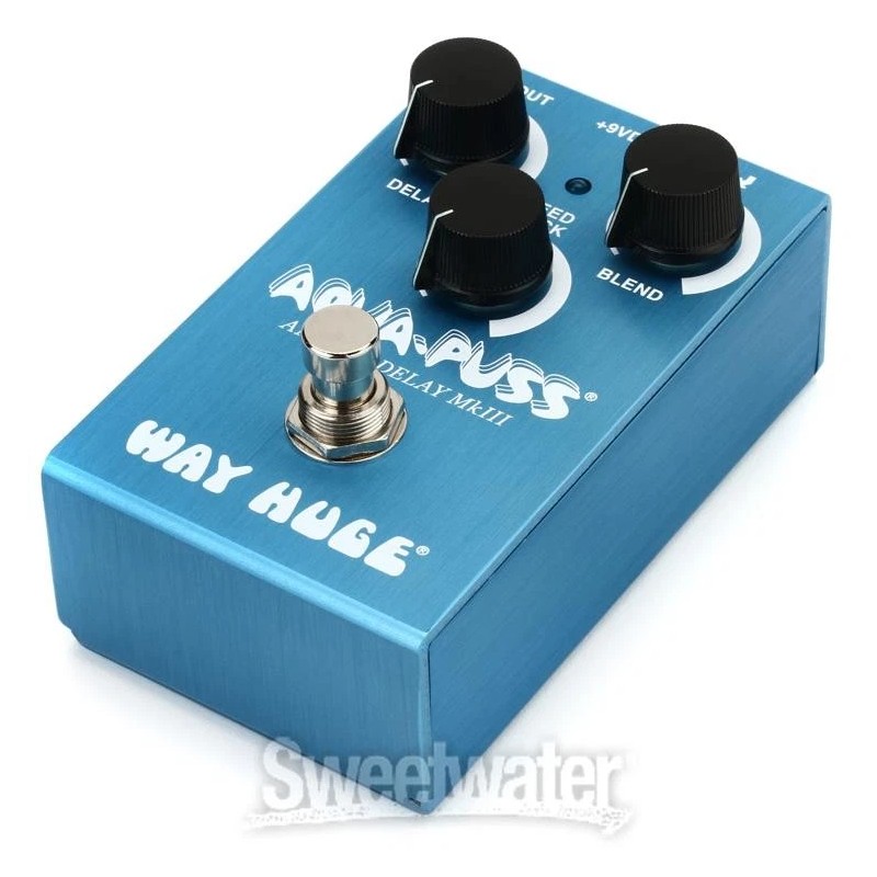 The Way Huge Smalls Aqua-Puss Analog Delay MkIII enchants riffs and fortifies leads with pure analog bucket brigade goodness. This reduced-size 'Puss packs all the tricks — including self-oscillation and chewy tape-style echo — of its larger namesakes. Operation is delightfully straightforward: set the length (Delay) and number (Feedback) of repeats and then blend to taste using the wet/dry (Blend) control. The Blend control is where the magic of this pedal lives, giving the MkIII a musical range that spans subtle coloration to ghostly wails and moans. The Aqua-Puss really shines for rockabilly-type slapback, where it's able to add depth and character without stepping on an arrangement. An added boon is the MkIII's true hard-wire bypass switching, which better preserves the integrity of your signal when disengaged.