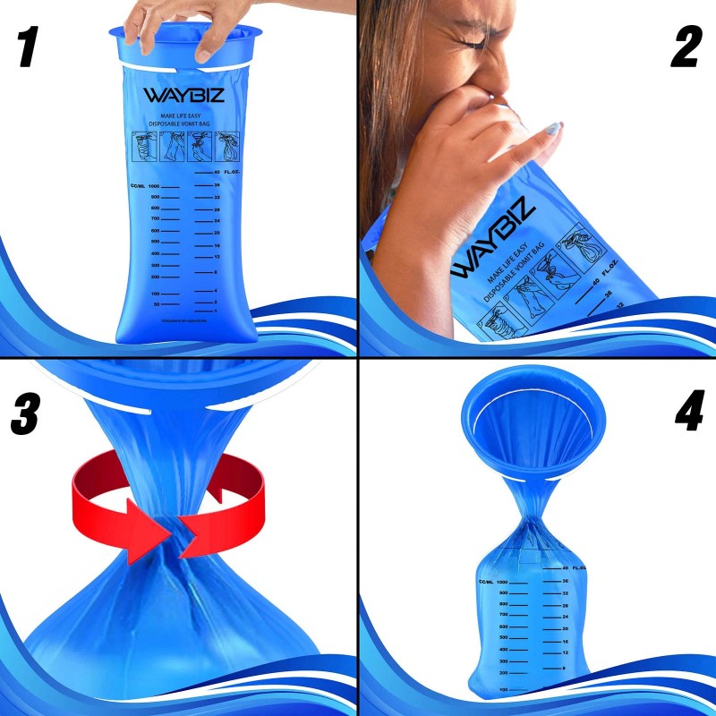 👍WAYBIZ premium quality Latex-free vomit bags are quite versatile, durable, safe and easy to use 👍These barf bags are very convenient to use in emergency arising from expected/unexpected vomit needs by patents, sick people, travelers and taxi commuters air and sea sickness 👍These Puke bags requires less space for storage while travelling and provides relief in case of motion and air sickness 👍Our Emesis bags are rather leak-proof and odor-proof. In case of vomit, both smell and content are sealed inside and the person avoids the disgrace in the need of use 👍These Vomit bags can be comfortably used on the beds/seats/rooms without any fear rather than going to bathroom bowing down to toilet filled with germs