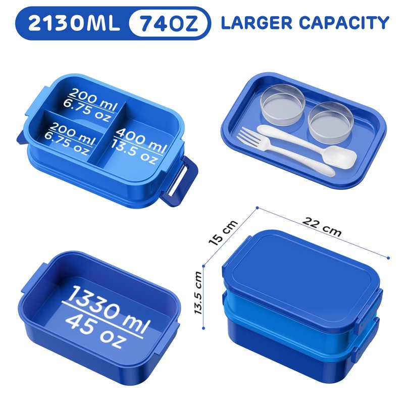- Large capacity lunch box 2130ml total for 3 layers. Size: 22 x 14 x 12 cm. Also comes with 2 sauce boxes.