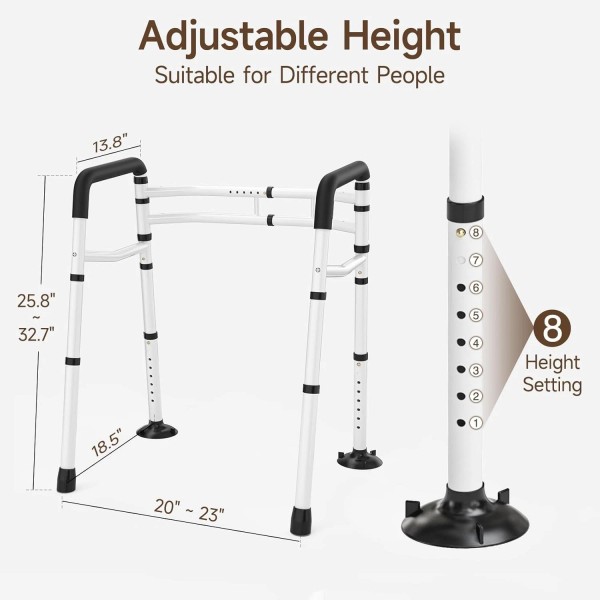 • Adjustable Design: Both the height (range: 25.8"-32.7") and width (range: 20"-23") are adjustable, allowing the toilet assist rails to accommodate different preferences and fit various toilet spaces