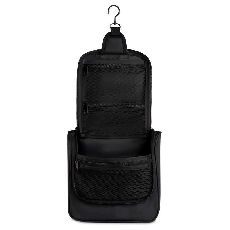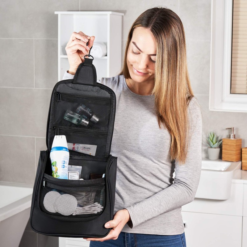 - COMPACT: Lightweight and convenient, our toiletries bag packs flat in luggage and folds down to save space when not full. When in use, hang it from its swivel hook or sit it on a countertop.