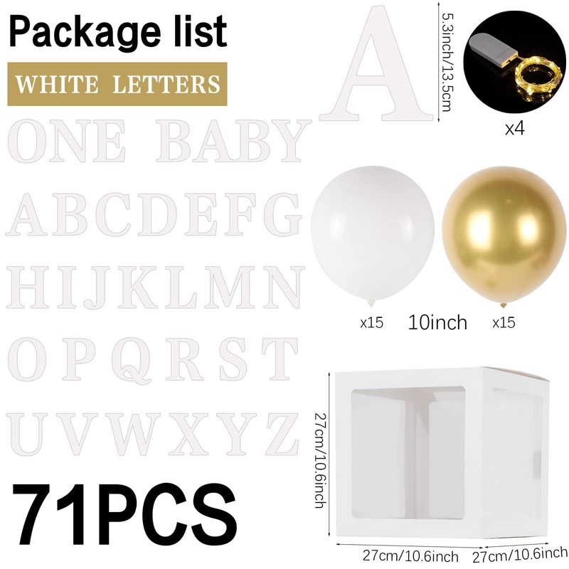 - 71Pcs Balloon Boxes Set with Lights - You will get 4Pcs 27*27*27 cm clear baby shower boxes with 33Pcs Letters(ONE+BABY+A-Z), 4Pcs Warm String Lights, 30Pcs 10inch Latex Balloons for party decoration (15Pcs Gold Balloons, 15Pcs White Sand Balloons). You'll also get 33Pcs Letters to DIY name, BABY, GlAD, LOVE, HOME, BOY, GIRL.Decorate your birthday, bridal shower, baby shower or gender reveal with baby boxes, impressing your guest and making a decoration that your family along with your little one will love.