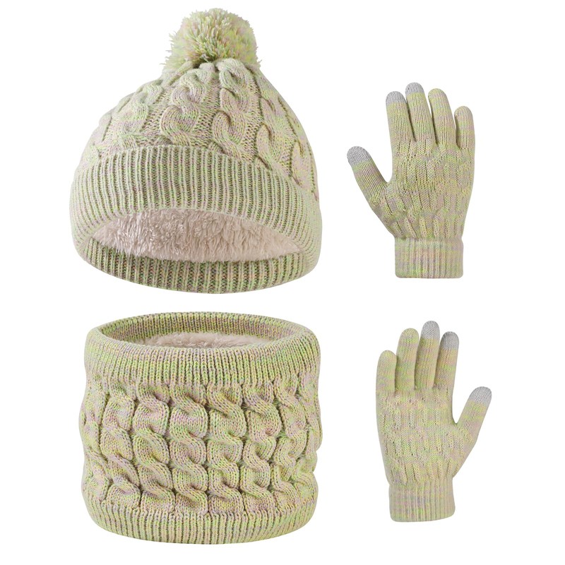 Waylipun Kids Winter Warm Beanie Hat Scarf Gloves Set, 3 in 1 Thermal Knitted Pom Pom Snood Scarf Gloves Set with Double Layer Fleece Lining for Kids Boys Girls 3-10 Year Old (Green Mix)