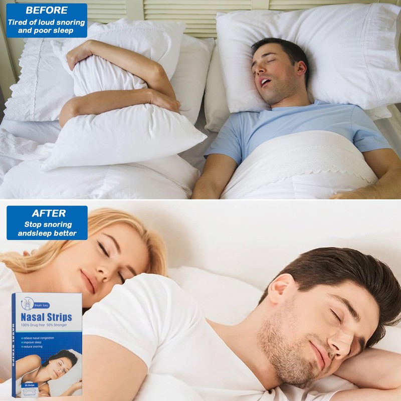 - Enhance your sleep quality and enjoy peaceful nights for you and your partner! Our nasal strips are specially designed to alleviate snoring and improve airflow, ensuring smoother breathing throughout the night. Crafted with comfortable materials that contour to your nose shape without irritation, suitable for all skin types. This drug-free solution provides immediate relief from snoring, allowing you and your partner to experience tranquil nights and rejuvenating sleep.