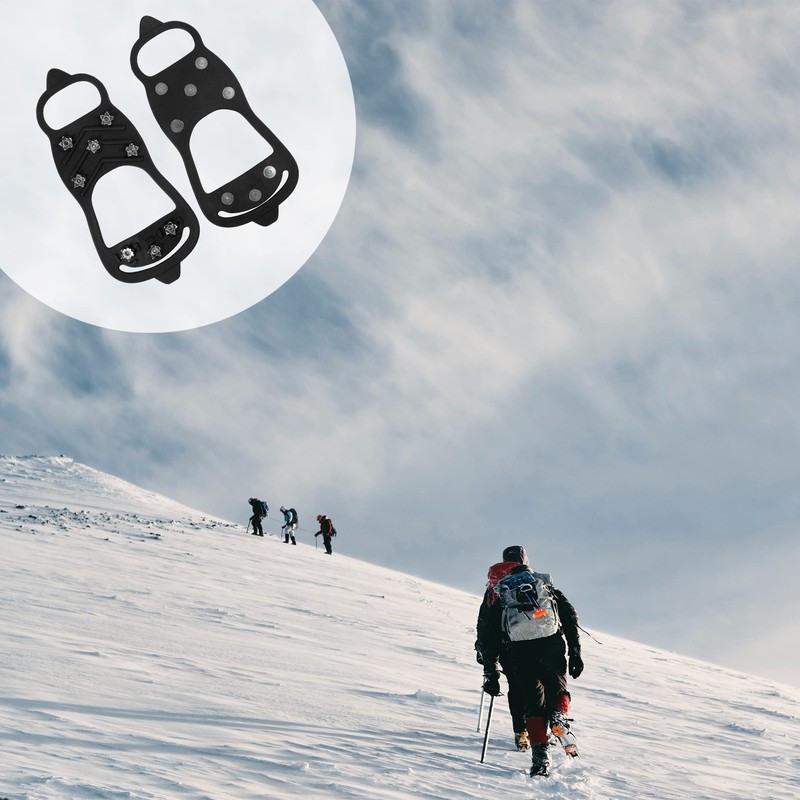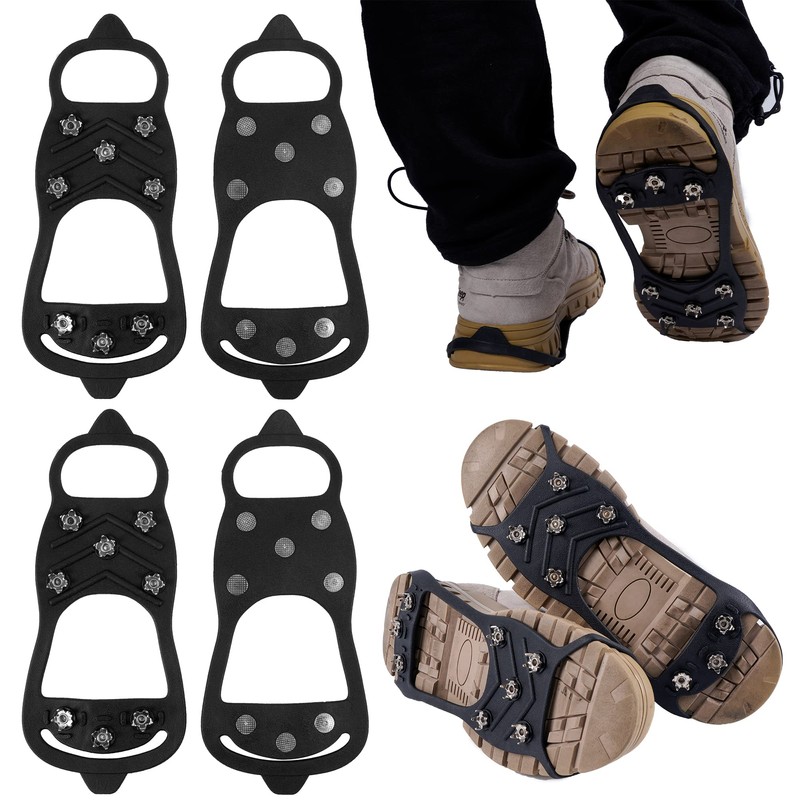 Features:The cushion made of thick and highly elastic rubber will not crack due to cold even at -45C.5 pieces of 201 stainless steel claws make it more firm and reliable, and make the feet feel comfortable, and will not make the soles of the feet painful like other Crampons.Portable and lightweight, storage is very simple, you can take it off when you finish the bad road section, just as easy as taking off your shoes, just fold it into a small bag.Used in harsh environments such as ice, snow, icy lanes, mud, wet grass, etc., suitable for hiking, fishing, walking, climbing, hunting, trail running and other activities.Package Includes: 2 pairs non slip gripper spikeColour: BlackFunction: Non-SlipMaterial: TPE Stainless and SteelTypes of shoes: hiking boots, sports shoes, fishing boots and hiking boots, etc.Warm Notes:It is not recommended to use indoors, it will damage the floor.This product does not include shoes/boots. The picture only shows more project details for your reference.