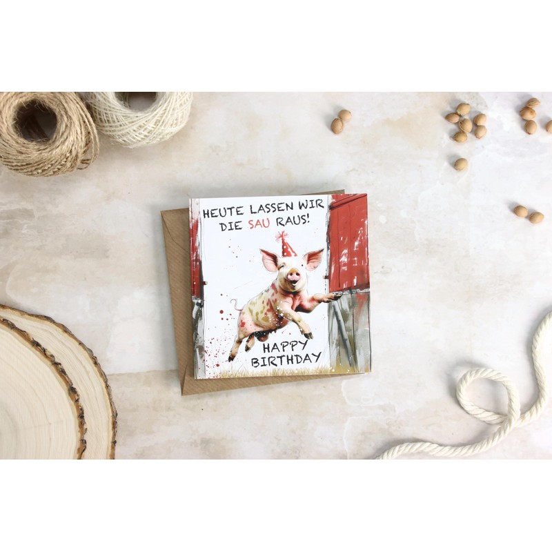 WBdesignz Birthday Card with Envelope - Funny Happy Birthday Card Today We Let the Sau Out - Funny Birthday Card (125 x 125 mm)